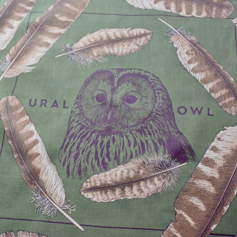 実物大で描いたフクロウと羽根を薄手の生地にプリントし、大判ハンカチに仕立てました。